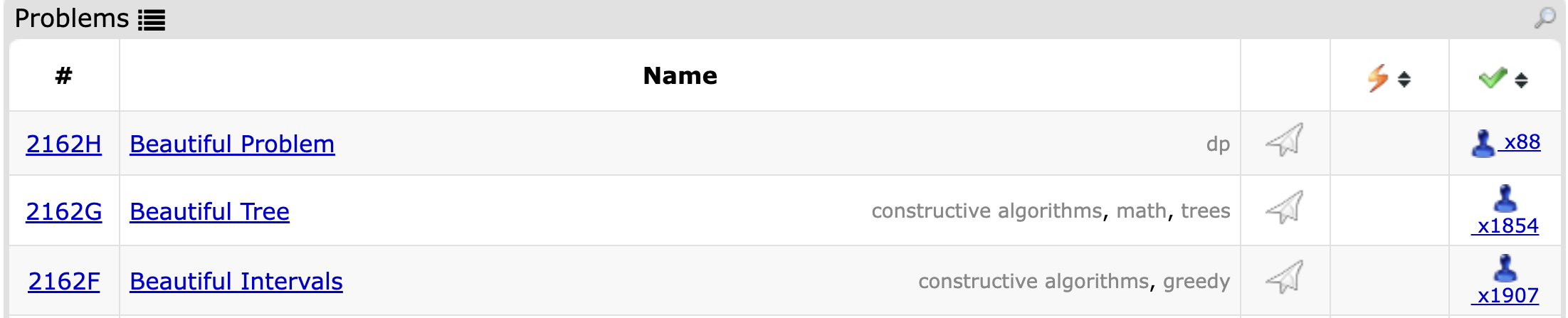 If you click on each one of those symbols you will be able to sort the tasks by that feature. Task difficulty is represented as a number which is a multiple of \(100\) in the range \([800, 3500]\).