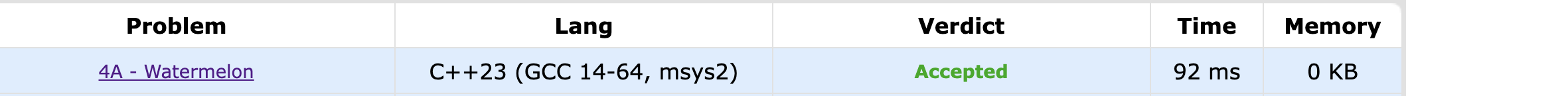 The task asks you to write a program which reads an integer w from input and check if that integer can be represented as the sum of two even positive integers a and b, then output “Yes” or “No”.